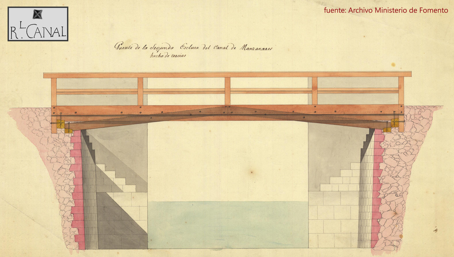 Se conserva un plano en sección (OH-635) de entre 1830 y 1840 en el que figura un puente de madera “hecho de tercias”. Este dato nos hace pensar en que inicialmente los puentes se habrían hecho de madera –como el de Santa Isabel- y por su falta de mantenimiento debieron sufrir pudriciones al estar tan expuestos a la humedad. A la postre fueron seguramente remplazados por puentes de fábrica, como el de la Quinta Esclusa, por lo que cabe concluir que constructivamente todas las esclusas del primer período –o sea, de la Primera a la Octava – sufrieron las mismas transformaciones.